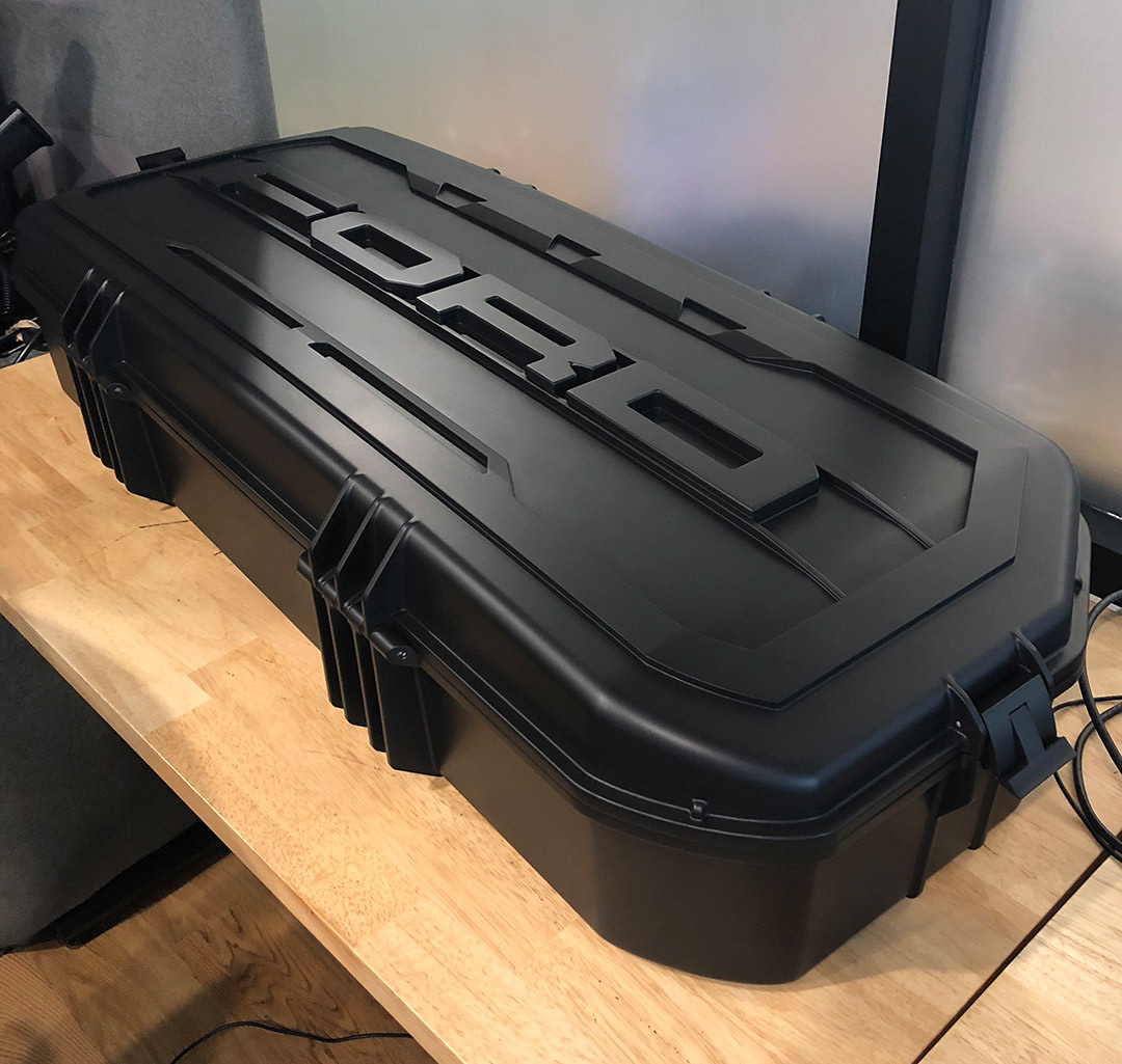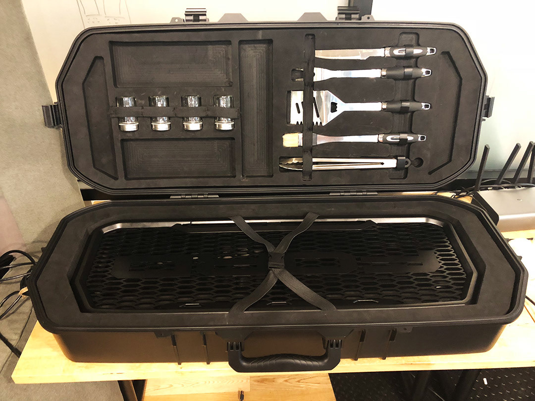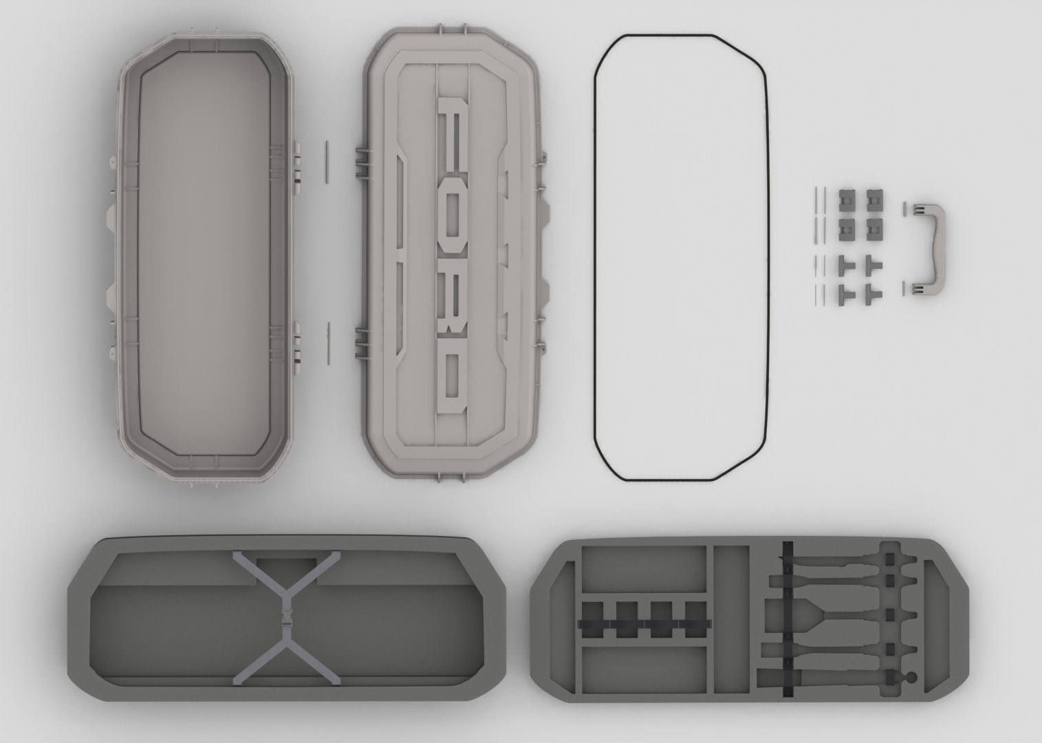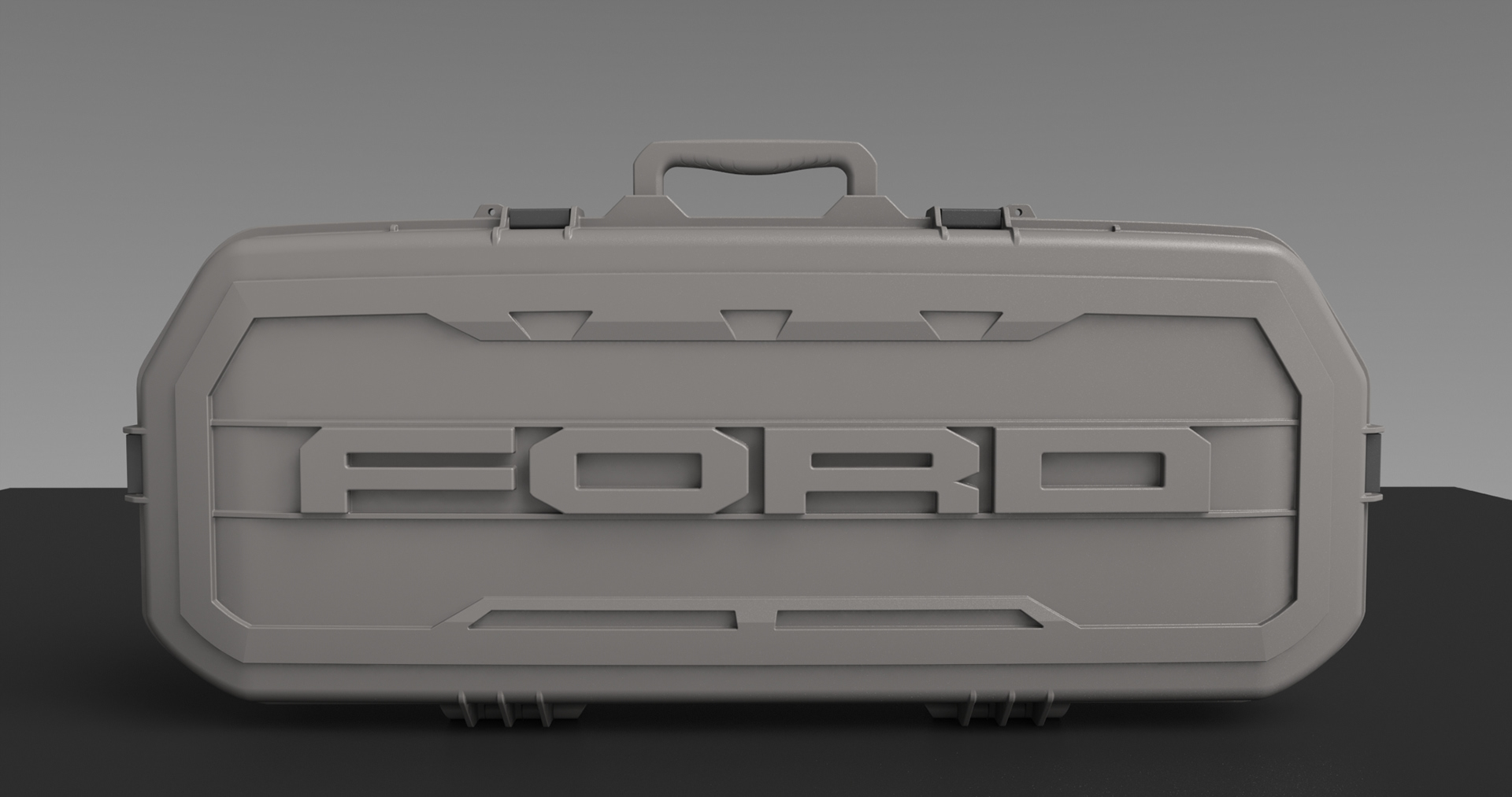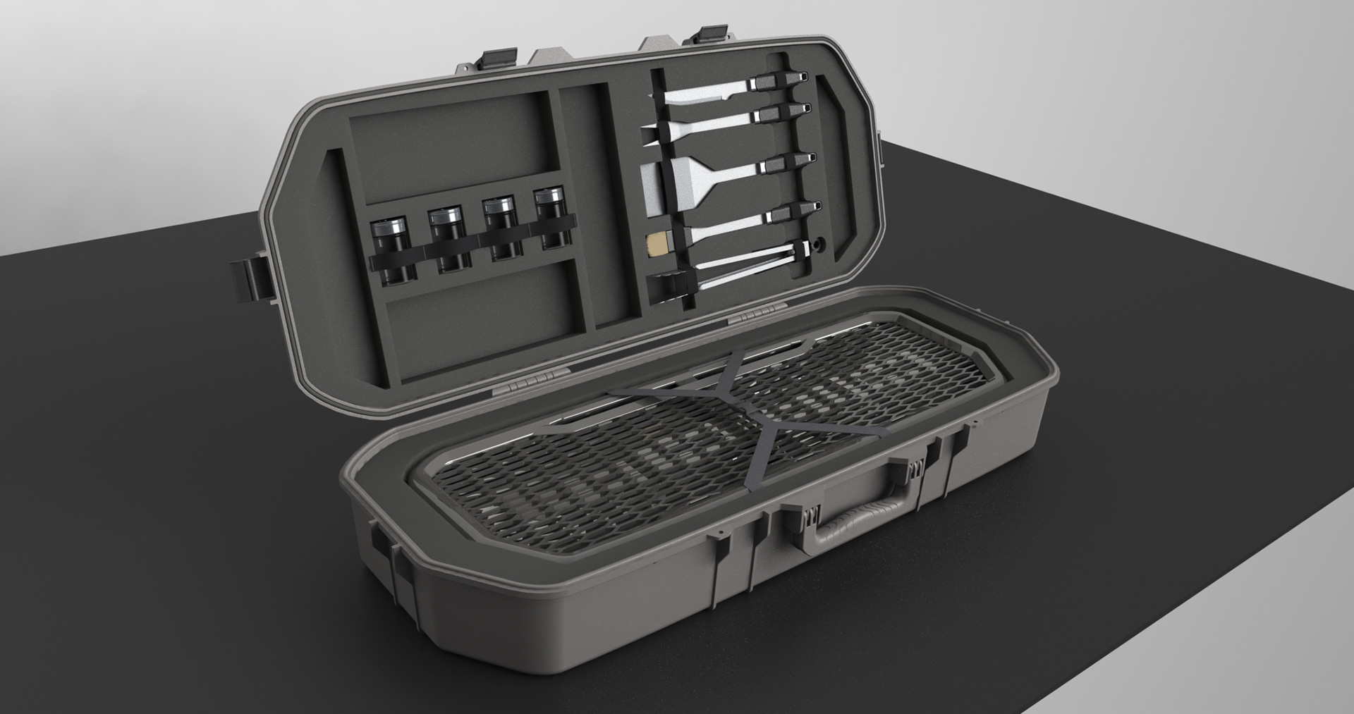 It's a fully functional detachable BBQ carry case, complete with grill, knives, and seasonings - all in the shape of the Ford Grille. Built in aluminium or steel, the case is sturdy enough to withstand the pulse-pounding terrains that Raptor’s traverses. Attributions: Concept, 3D Modeling, Rendering